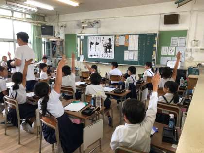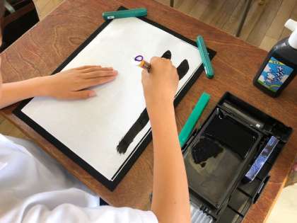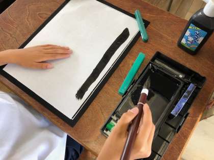 座る姿勢や筆の持ち方、机の上に置くものなど準備の仕方をしっかりと学びました。その後、墨をつけて半紙に線を書きました。子どもたちは初めての筆に戸惑いながらも、集中して活動に取り組んでいました。