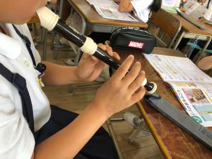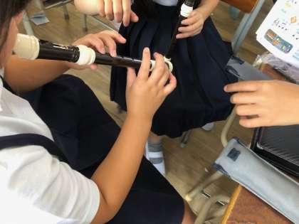 「シ」「ラ」と一つずつ吹ける音が増えてきました。吹ける音が増えたことで、吹ける曲も増えてきました。子どもたちは休み時間にも、熱心に練習しています。友だちと教えあいながら練習する様子も見られました。