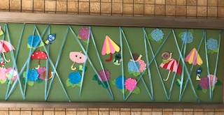 掲示委員会では、ピロティの掲示板に季節に合った掲示物を毎月作成しています。6月は、雨の季節。雨が大好きなカエルやカタツムリは、掲示板の中でもニコニコしています。掲示委員会の毎月の作品を楽しみにしていてくださいね。