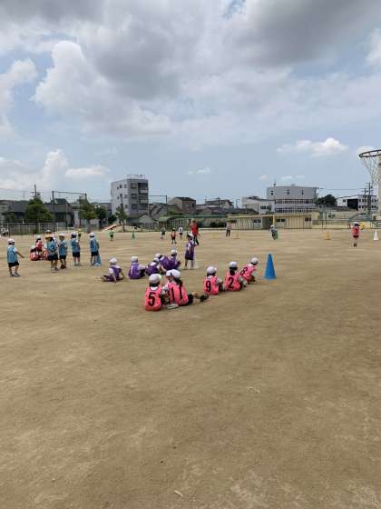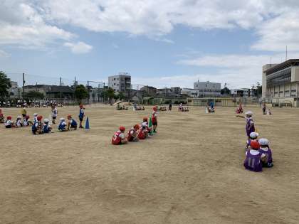 チームごとに分かれて、ケンケンやうさぎとびをしました。