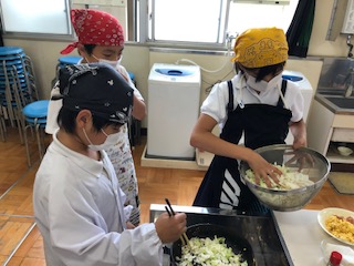 家庭科の学習で調理実習を行いました。子ども達は自分達で選んだ野菜を協力して切り分け、フライパンで炒めました。塩胡椒でシンプルに味付けた野菜ですが、自分達で調理した野菜炒めに子ども達からは『美味しい!』と笑顔を見せていました。