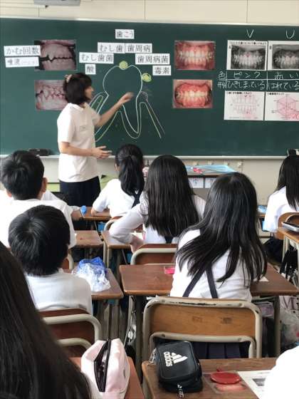 子どもたちは、自分の生活を振り返り、虫歯や歯周病などにならないために、真剣に話を聞いていました。
