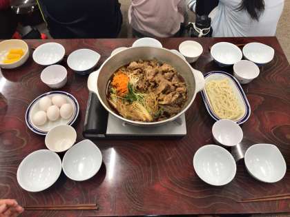 お風呂に入ってさっぱりした後は、おいしいすき焼きです。いただきます!
