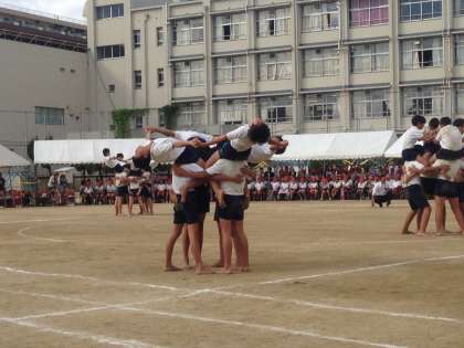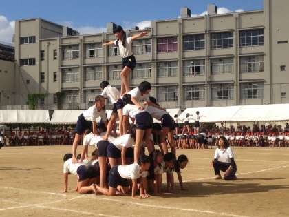 肩車や変形ピラミッドなどの組み合わせ技です!そろそろ土台の子が大変な技になってきました!上に乗る子たちも緊張します!