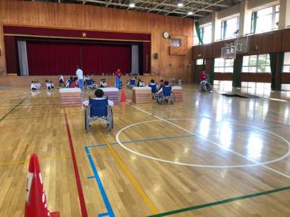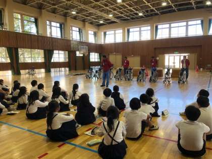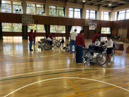 体育館の中を、車いすに乗って自分で走行する「自走体験」、友だちに押してもらい校内を走行する「介助体験」をさせていただきました。車いすに乗って生活することについて理解を深めることができました。