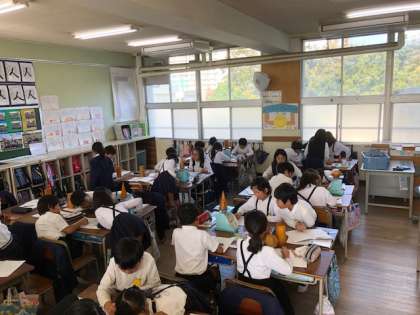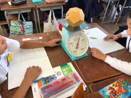 作った天秤で重さを比べたり、はかりを使って重さを調べたりしています。目盛りをよむのに苦戦している様子も見られましたが、班で話し合いながら学んでいました。