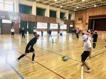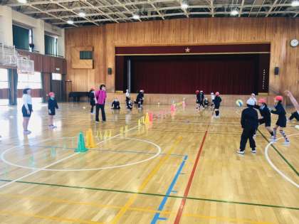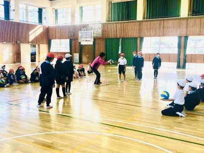 体育館での体育ではボール運動でプレルボールをしています。3人は1チームになって「プレル」「プレル」「キャッチ」を掛け声に特訓中です。試合に向けて、パスやキャッチの練習をして少しずつチームワークを高めていっています!