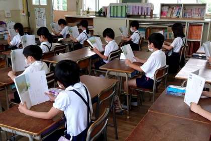 背筋を伸ばし、教科書を立てて、みんなで声をそろえて音読をしました。元気な声で音読できないことが少し残念ですが、一人一人しっかりと音読できていました。