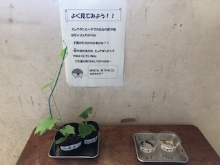 先週から4年生の教室前に置いてあった、ヒョウタンとヘチマの苗と種。