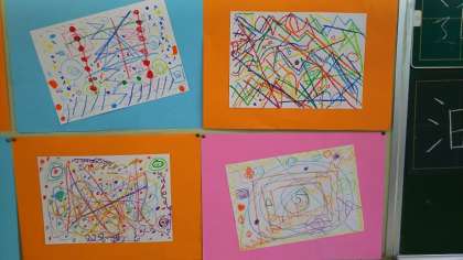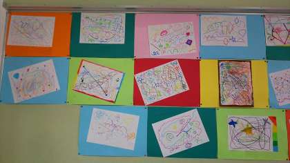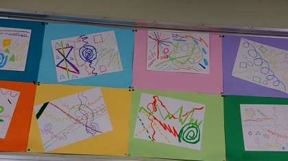 分散登校中に取り組み始めた、いろいろな色の線と形の絵が完成しました。