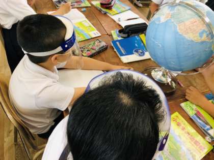 5年生の社会科では世界の国々についての学習をしています。地球儀の使い方を確認したり、緯度や経度といった言葉を確認しました。また、世界の国の場所を調べて、たくさんの国の名前を知ることができました。次の単元では日本の国土や地形の特色についても学習をすすめていきます!