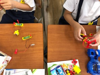 乾電池とモータ−をどう線でつないで、プロペラを回す実験をしました。