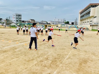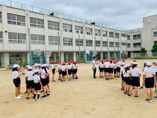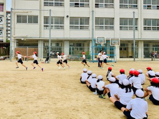 運動場での体育では運動会に向けてリレーの練習をしています。スタートダッシュからバトンや渡す間隔をチームに分かれて確認したり、間隔を決めてからはバトンの受け渡しを実際に行なったりしました!はじめは上手に受け渡しできていなかったチームも繰り返し練習することで、少しずつスムーズに渡すことができるようになってきました!!