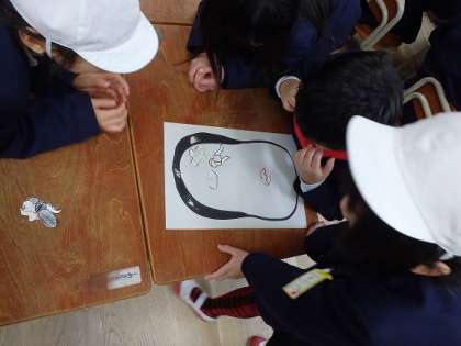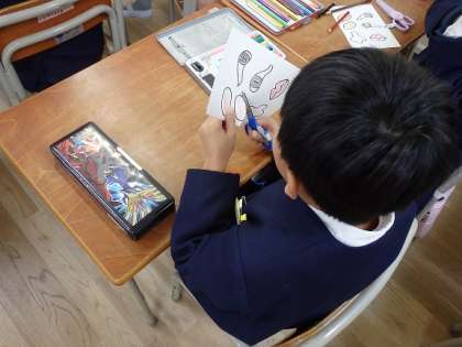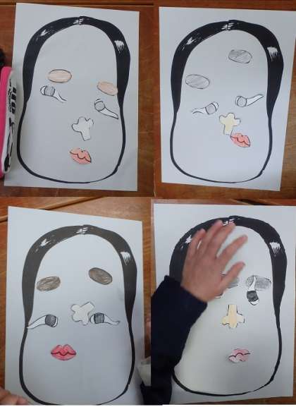 お正月遊びの定番、福笑いを作り、班の友だち同士で楽しみました。