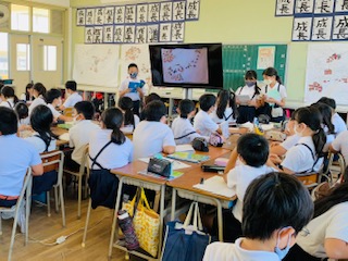 10月の社会科では日本の産業についての学習をしています。国内の農業、漁業、畜産業について用意しておいた野菜やお肉、お米の広告から生産している都道府県を調べ、大きな日本地図に貼っていきました。そこから分かったことをノートに書き、班やクラスで交流して考えをまとめました!!