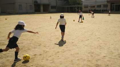ボールを蹴って、コーンに当てる的あてをしました。的に当たらないと遠くまでボールが転がっていってしまうので、蹴って、走って、みんな必死でした。