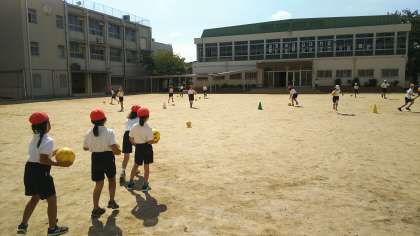 運動場では、ボールを使って体育をしています。