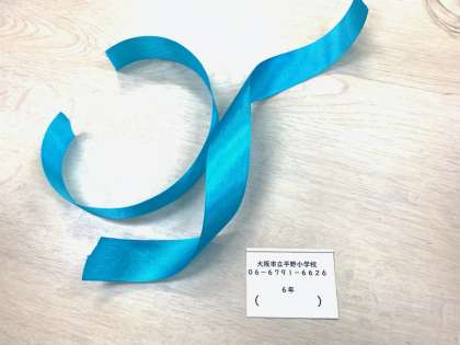 子どもたちには、写真に載せてあるように、リボン2本と小さなカード(学校名と電話番号入り)を配りました。