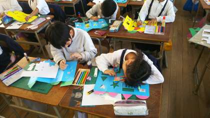 一人ひとりいろいろな窓を作り、裏から絵を貼りつけています。