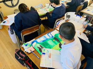 図画工作科では、マグリットやルソー、シャガールなどの芸術家の絵をパソコンを使って調べて、その特徴を生かした作品を描く学習をしています。自分がなりきる芸術家の絵を決め、下描きで大体のイメージをつかんだ後は、絵の具を使って画用紙に着色していきました。しっかり塗り込んだり、点描を意識してドットで塗り込んだりなど、子どもたちは自分なりに工夫して、一生懸命取り組む姿が多くみられました!