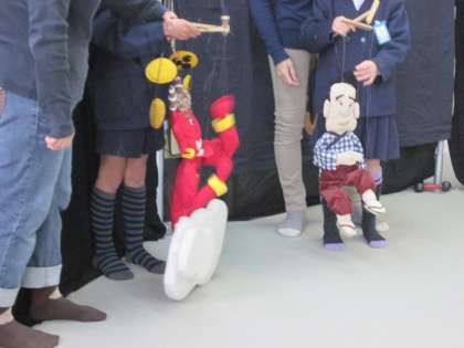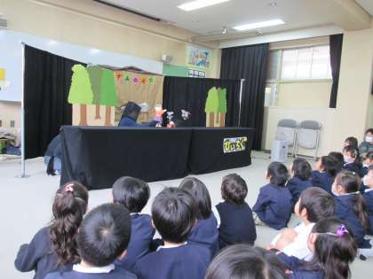 今日は、劇団ピーチクの方々に、人形劇をしていただきました。「おむすびころりん」と「てんまのとらやん」の劇でした。子どもたちの中にはお話を知っている子もいました。かわいいお人形さんたちの劇の世界に、子どもたちはあっという間に引き込まれ、真剣に聞き入ったり、おもしろいところでは笑ったり、とても楽しい時間を過ごすことができました。最後に、数人の子どもたちが人形劇の体験もさせていただくことができ、人形劇のおもしろさを味わうことができました。ピーチクのみなさま、本当にありがとうございました。