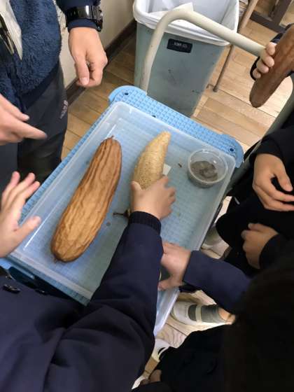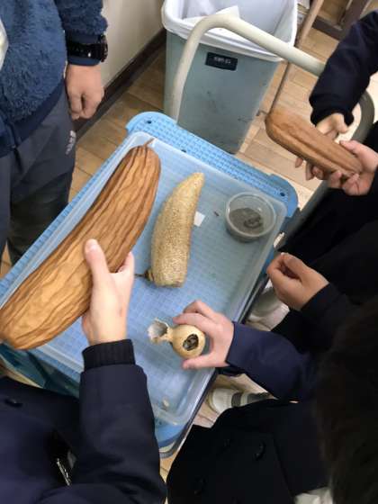 ヘチマは下に穴が開き種を出していたり、周りの皮がなくなってスポンジのようになったりしていました。