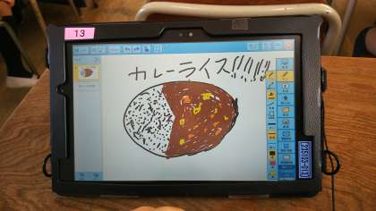 発表ノートのアプリを使い方を確認しました。ノートを起動し、自分の名前を書いたり、自分の好きな食べ物の絵などを描いたりしました。