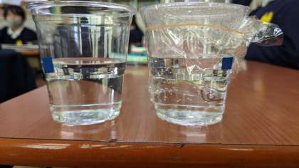 2つのコップに水を入れ、片方にはラップでふたをしました。