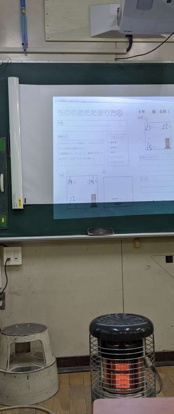 授業の前半と後半で温度を確認すると3つとも温度が上がっていました。教室の上と下で温度が違うことから、あたためられた空気は上にいくことが確認できました。