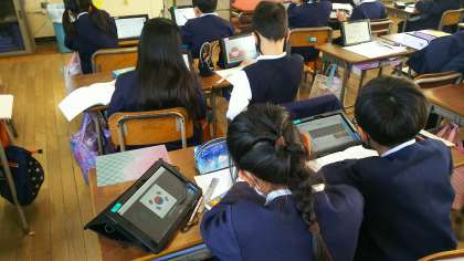 国語科の学習で、自分が興味のある国のことをタブレットを使って調べました。