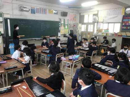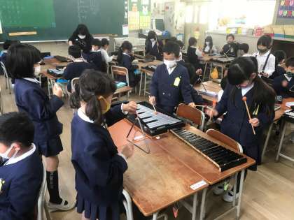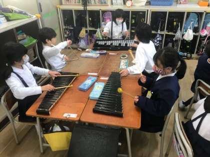一年生は、木琴、鉄琴、トライアングル、すずを使って、「きらきら星」の練習をしています!