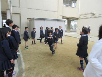 運動場でおにごっこ、バスケなどなど。今回は中庭で大なわをしている子どもたちをキャッチしました。8の字で記録更新を目指して、みんなでつながる様子がたくさん見られました! まさに子どもは風の子ですね!!