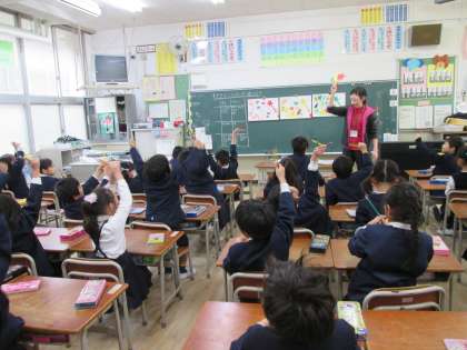 写真は、栄養教諭の畑田先生の食育の授業の様子です。子どもたちの好きな食べ物やきらいな食べ物を発表するところから始まりました。その後、楽しい紙しばいやクイズを通して、赤・黄・緑の食べ物をバランスよく食べることが大切だということがよくわかりました。食べ物のマグネットもたくさん出てきて、子どもたちは大喜び!給食は、3つの色の栄養がすべて含まれていることも知り、「これからも給食を残さず食べよう!」という声も聞こえました。
