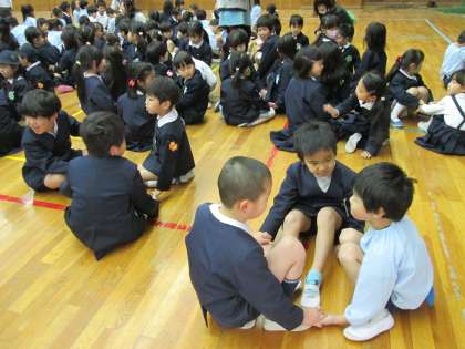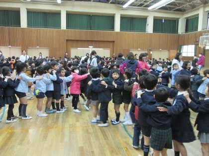 体育館でいっしょに遊んだり歌ったりした交流会では、1年生の子どもたちが、「学校、楽しいよ」「待ってるからね」など、やさしく声をかけるほほえましい場面がたくさん見られました。