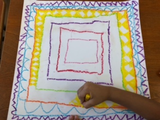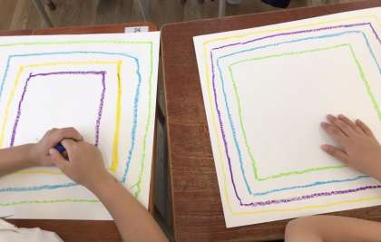 図画工作科の学習では、「おしゃれなハンカチ」を作っています。パスで四角の枠を描き、いろいろな模様を描いて、自分だけのハンカチを作成中です。世界一おしゃれなハンカチを目指してみんなで頑張っています!