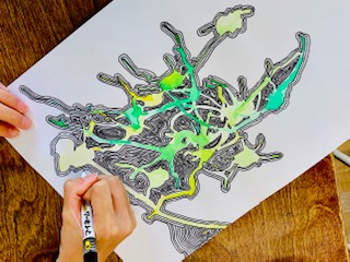 画用紙に自分で選んだ絵の具を垂らし、息を吹きかけて様々な模様を作ったあと、細いサインペンの先を使って模様を囲うようにどんどん線を描き足していきます。