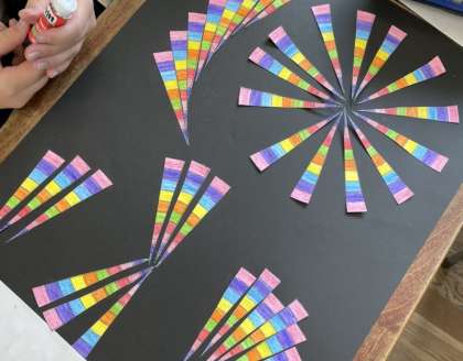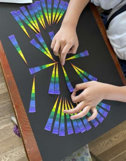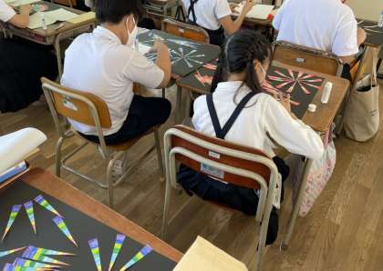 図工では、「色と形を工夫して」というテーマで色を塗った図形を並べた作品を作っています。