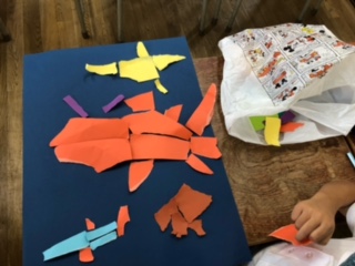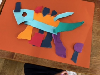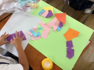 図画工作では、破った画用紙を組み合わせていろいろなものを作っています。