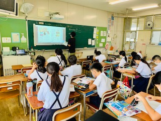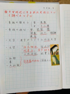 社会科の学習では、平安時代に生まれた文化について学習しています。当時の貴族の服装やあそび、食事、1日のスケジュールなどを教科書から調べてノートにまとめました。