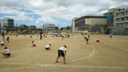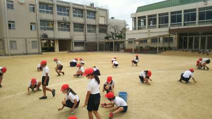 みんなが使う運動場を安全な場所にするために、がんばって石を探して、拾っていました。