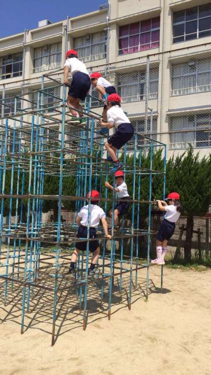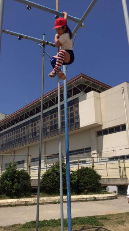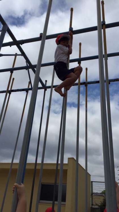 のぼり棒では、ほぼしがみついているだけの子もいれば、早くも一番上まで到達してしまう子も!