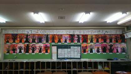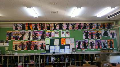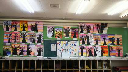 夕焼け空の色の変化や墨汁で描いた木や枝に、一人一人オリジナルの工夫があり、どの作品も見ごたえがあります。