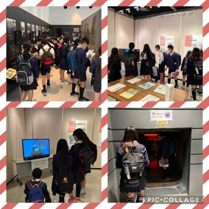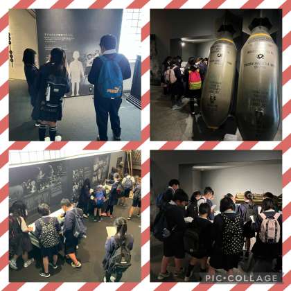 実物大の爆弾や防空壕を見て、感じたこと考えたことを話しながら、ワークシートをまとめています。