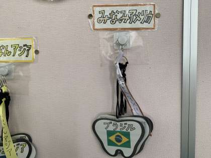 保健室の掲示板に、世界の子どもたちは、歯が抜けた時にどうするのか、地域に分けて紹介しています。