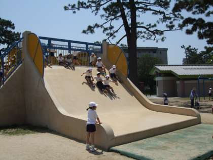 幅の広い特大すべり台も 友だちとなら こわくない。