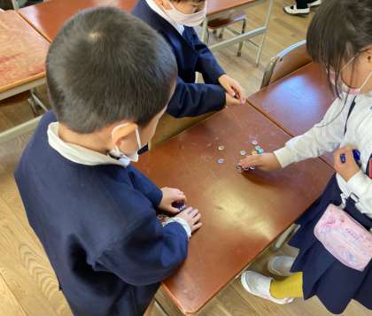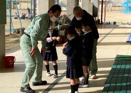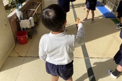 生活科で「昔遊び」をしました。おはじき、お手玉、めんこ、けん玉、こま回し、だるま落とし。初めてする遊びもあったようです。管理作業員さんにもこま回しの先生になってもらいました。
