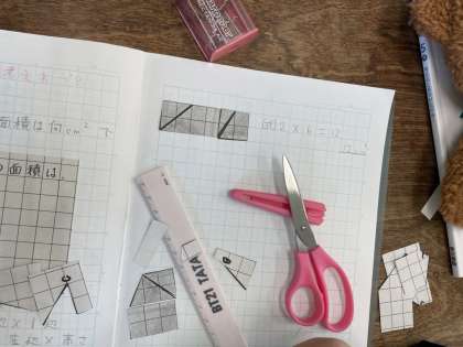正方形、長方形の面積に比べると少し難しいですが、子どもたちは図形を変形したり公式を使ったりして求めようと頑張っています。