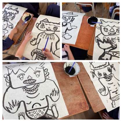 顔を描いて、体を描いて、絵の具で色をつけました。