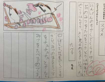 国語科の「子どもをまもるどうぶつたち」の学習をした後、いろいろな動物のちえについて本で調べました。調べたことをカードに書いて、みんなに紹介しました。