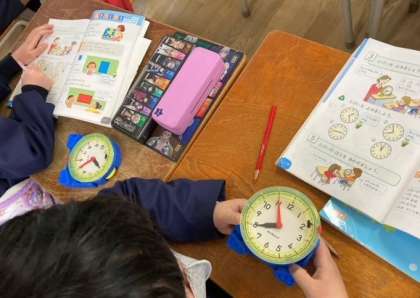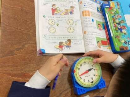2学期には「なんじ」「なんじはん」の学習でしたが、今回は「なんじなんぷん」の読み方を学習しました。「なんじ」は短い針を見て、「なんぷん」は長い針を見て、5とびを使って数えました。